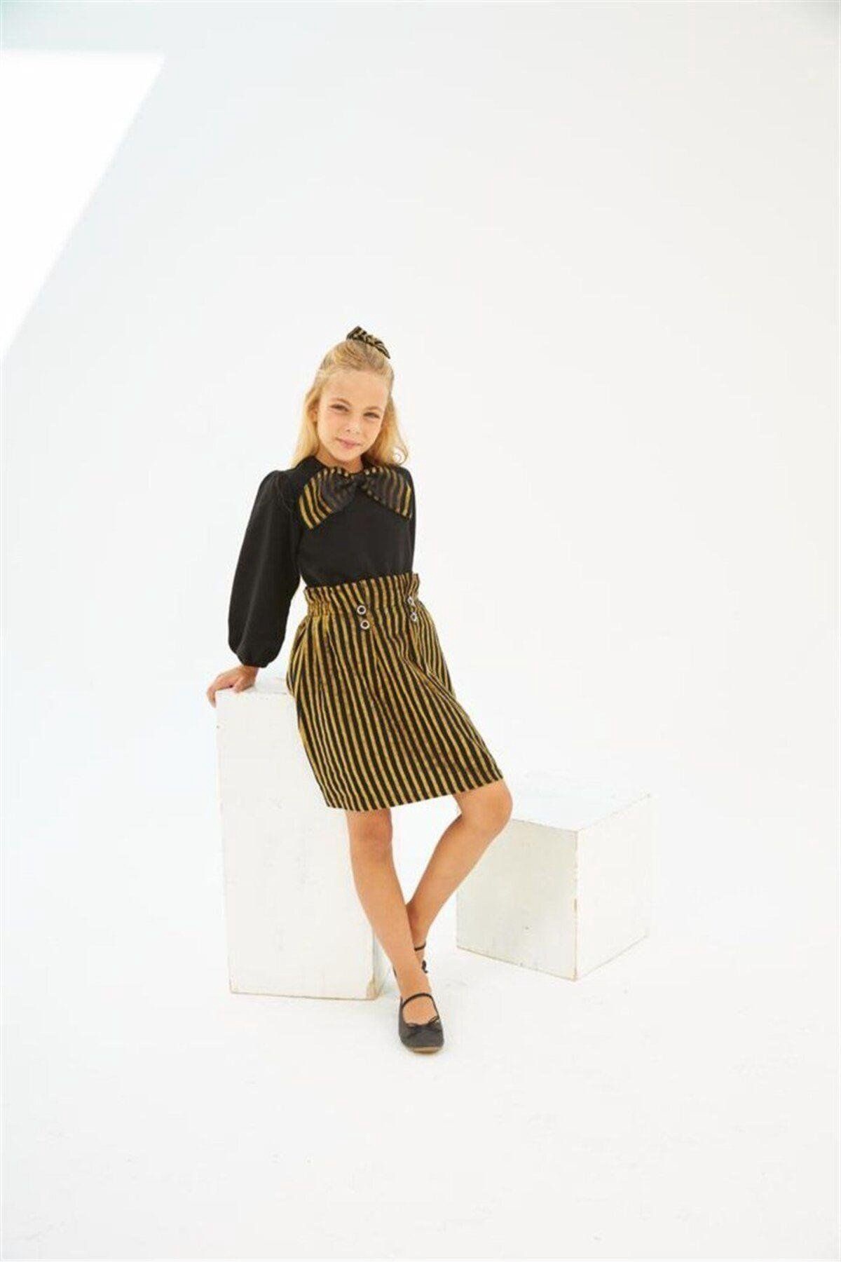 Kız Çocuk Siyah Bluz Çizgili Etek Toka 3&;lü Takım