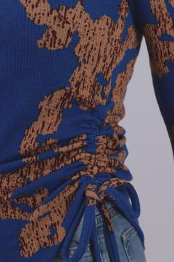 Kadın Mavi-Bej Asimetrik Yaka Yandan Büzgülü Etek Ucu Yırtmaçlı Uzun Kollu Bluz ARM-26K001022ARM-26K001022MAVİ-BEJ
