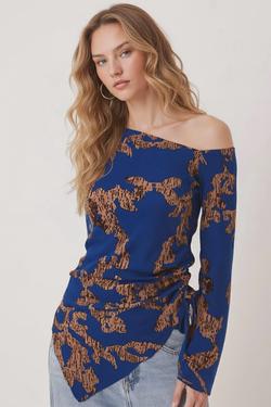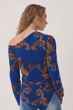Kadın Mavi-Bej Asimetrik Yaka Yandan Büzgülü Etek Ucu Yırtmaçlı Uzun Kollu Bluz ARM-26K001022