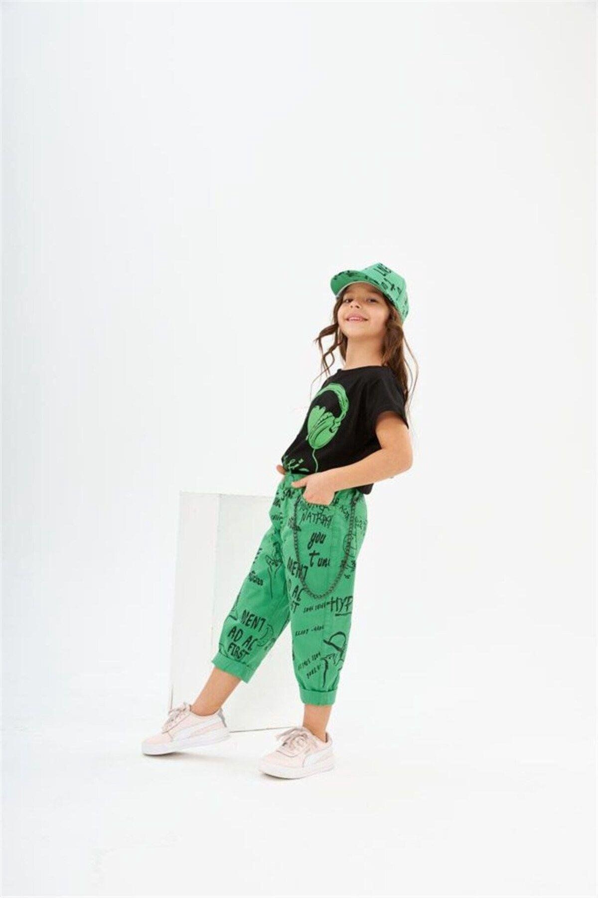 Kız Çocuk Kulaklık Baskılı Siyah Tişört Zincirli Yazılı Kot Kapri Şapkasız 2&;li Takım