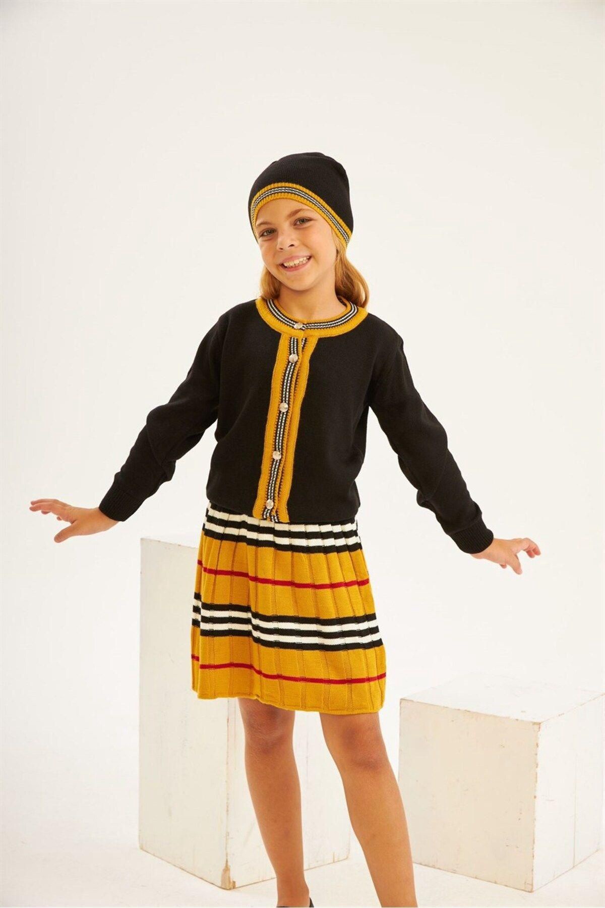 Kız Çocuk Sıfır Yaka Triko Hırka Çizgili Etek Bere 3&;lü Takım
