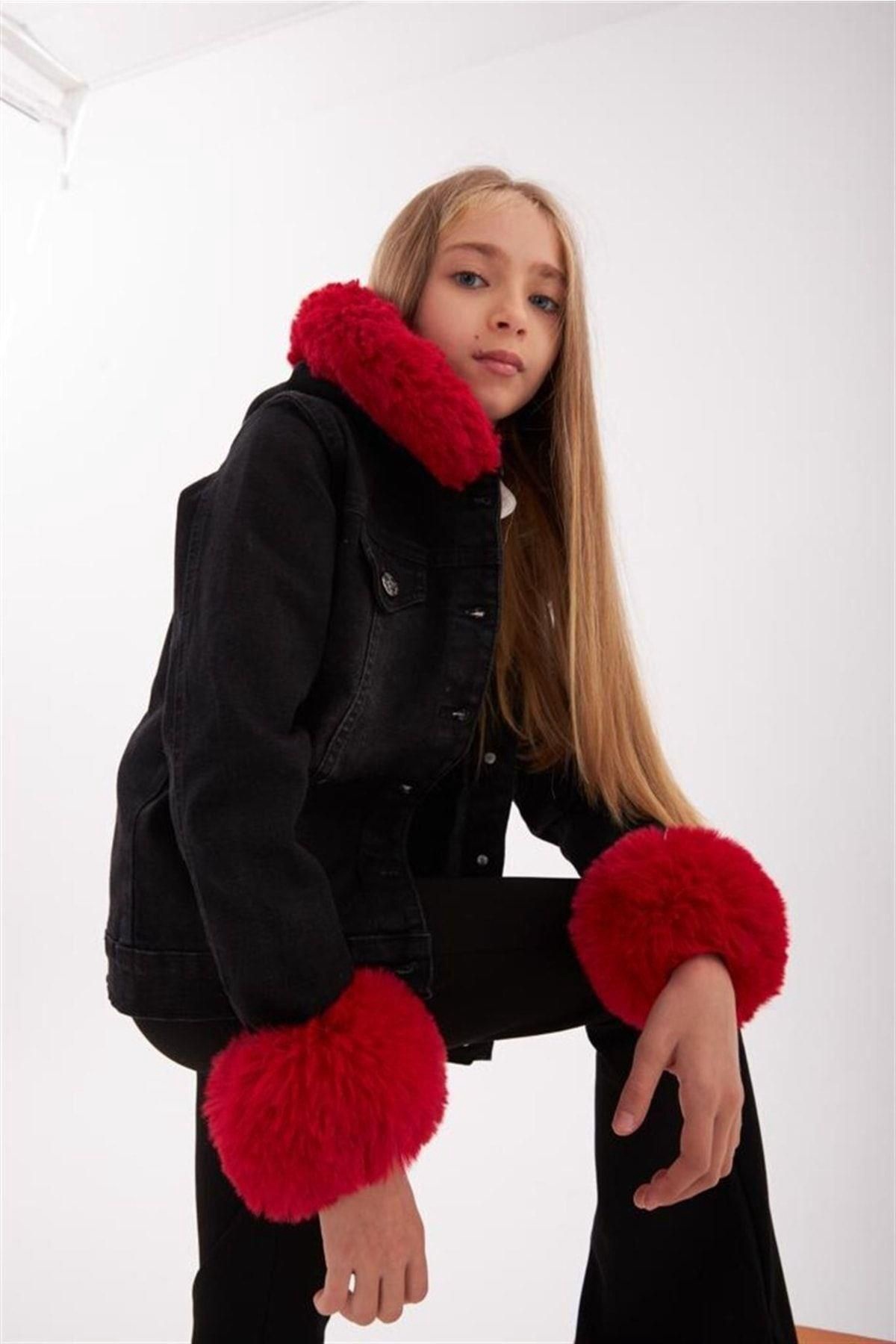 Kız Çocuk Kapüşonu Ve Kolları Renkli Kürklü Siyah Kot Ceket