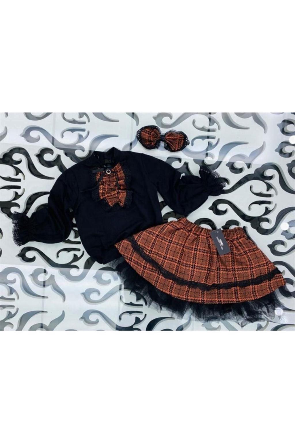 Kız Çocuk Parça Detaylı Siyah Bluz Ekose Desenli Etek Toka 3&;lü Takım